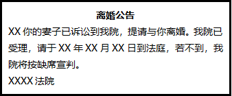 XX你的妻子已訴訟到我院,提請與你離婚。我院已受理,請于XX年XX月XX日到法庭,若不到,我院將按缺席宣判。