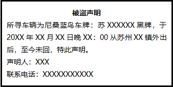 所尋車輛為尼桑藍(lán)鳥車牌:蘇XXXXXX黑牌,于20XX年XX月XX日晚XX:00從蘇州XX鎮(zhèn)外出后,至今未回,特此聲明。