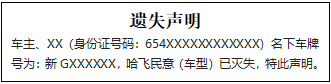 車主、XX(身份證號(hào)碼:654XXXXXXXXXXXX)名下車牌號(hào)為:新GXXXXXX,哈飛民意(車型)已滅失,特此聲明。