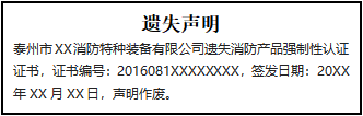 泰州市XX消防特種裝備有限公司遺失消防產(chǎn)品強(qiáng)制性認(rèn)證證書(shū),證書(shū)編號(hào):2016081XXXXXXXX,簽發(fā)日期:20XX年XX月XX日,聲明作廢。