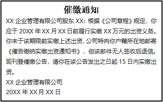 XX企業(yè)管理有限公司股東XX:根據(jù)《公司章程》規(guī)定,你應(yīng)于20XX年XX月XX日前履行實繳XX萬元的出資義務(wù)。你未于該期限前實繳上述出資,公司特向你戶籍所在地郵寄《催告繳納實繳出資通知書》,但該郵件無人簽收后退信。現(xiàn)刊登催繳公告,請你在該公告發(fā)出之日起15日內(nèi)實繳出資。