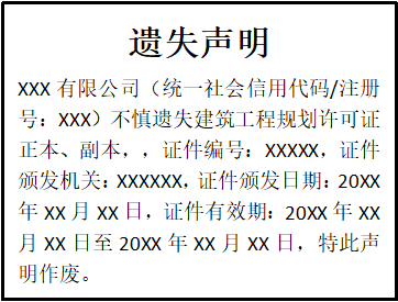 XXX有限公司(統(tǒng)一社會信用代碼/注冊號:XXX)不慎遺失建筑工程規(guī)劃許可證正本、副本,證件編號:XXXXX,證件頒發(fā)機(jī)關(guān):XXXXXX,證件頒發(fā)日期:20XX年XX月XX日,證件有效期:20XX年XX月XX日至20XX年XX月XX日,特此聲明作廢。