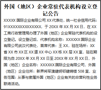 外國(地區(qū))企業(yè)常駐代表機構設立登記公告