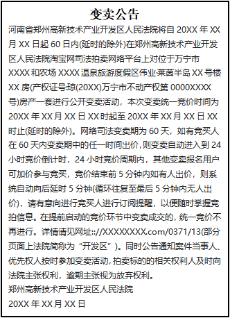 河南省鄭州高新技術(shù)產(chǎn)業(yè)開發(fā)區(qū)人民法院將自20XX年XX月XX日起60日內(nèi)(延時(shí)的除外)在鄭州高新技術(shù)產(chǎn)業(yè)開發(fā)區(qū)人民法院淘寶網(wǎng)司法拍賣網(wǎng)絡(luò)平臺(tái)上對(duì)位于萬寧市XXXX和農(nóng)場XXXX溫泉旅游度假區(qū)偉業(yè)·萊茵半島XX號(hào)樓XX房(產(chǎn)權(quán)證號(hào):瓊(20XX)萬寧市不動(dòng)產(chǎn)權(quán)第0000XXXX號(hào))房產(chǎn)一套進(jìn)行公開變賣活動(dòng),本次變賣統(tǒng)一競價(jià)時(shí)間為20XX年XX月XX日XX時(shí)起至20XX年XX月XX日XX時(shí)止(延時(shí)的除外)。網(wǎng)絡(luò)司法變賣期為60天,如有競買人在60天內(nèi)變賣期中的任一時(shí)間出價(jià),則變賣自動(dòng)進(jìn)入到24小時(shí)競價(jià)倒計(jì)時(shí),24小時(shí)競價(jià)周期內(nèi),其他變賣報(bào)名用戶可加價(jià)參與競買,競價(jià)結(jié)束前5分鐘內(nèi)如有人出價(jià),則系統(tǒng)自動(dòng)向后延時(shí)5分鐘(循環(huán)往復(fù)至最后5分鐘內(nèi)無人出價(jià)),請(qǐng)有意向進(jìn)行競買人進(jìn)行訂閱提醒,以便隨時(shí)掌握競拍信息。在提前啟動(dòng)的競價(jià)環(huán)節(jié)中變賣成交的,統(tǒng)一競價(jià)不再進(jìn)行。詳情請(qǐng)見網(wǎng)址:http://XXXXXXXX.com/0371/13(部分頁面上法院簡稱為“開發(fā)區(qū)”)。同時(shí)公告通知案件當(dāng)事人、優(yōu)先權(quán)人按時(shí)參加變賣活動(dòng),拍賣標(biāo)的的相關(guān)權(quán)利人及時(shí)向法院主張權(quán)利,逾期主張視為放棄權(quán)利。