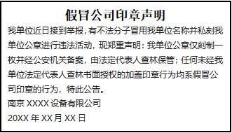 我單位近日接到舉報,有不法分子冒用我單位名稱并私刻我單位公章進(jìn)行違法活動,現(xiàn)鄭重聲明:我單位公章僅刻制一枚并經(jīng)公安機(jī)關(guān)備案,由法定代表人查林保管;任何未經(jīng)我單位法定代表人查林書面授權(quán)的加蓋印章行為均系假冒公司印章的行為,特此公告。
