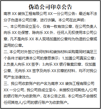 南京XX裝飾工程有限公司XX一分公司公告:最近有不法分子偽造本公司印章,進行詐騙。本公司在此聲明: