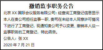 北京XX國際會(huì)議服務(wù)有限公司:經(jīng)查詢工商登記信息顯示本人在貴公司擔(dān)任監(jiān)事一職,貴司在未經(jīng)本人同意許可情況下進(jìn)行了工商登記,現(xiàn)通知貴公司予以變更、撤銷本人這一監(jiān)事職務(wù)的工商登記,特此函告。