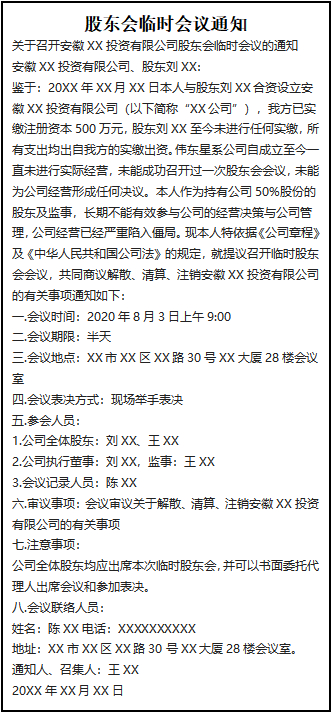 鑒于:20XX年XX月XX日本人與股東劉XX合資設(shè)立安徽XX投資有限公司(以下簡(jiǎn)稱“XX公司”),我方已實(shí)繳注冊(cè)資本500萬元,股東劉XX至今未進(jìn)行任何實(shí)繳,所有支出均出自我方的實(shí)繳出資。偉東星系公司自成立至今一直未進(jìn)行實(shí)際經(jīng)營,未能成功召開過一次股東會(huì)會(huì)議,未能為公司經(jīng)營形成任何決議。本人作為持有公司50%股份的股東及監(jiān)事,長期不能有效參與公司的經(jīng)營決策與公司管理,公司經(jīng)營已經(jīng)嚴(yán)重陷入僵局,F(xiàn)本人特依據(jù)《公司章程》及《中華人民共和國公司法》的規(guī)定,就提議召開臨時(shí)股東會(huì)會(huì)議,共同商議解散、清算、注銷安徽XX投資有限公司的有關(guān)事項(xiàng)通知如下: