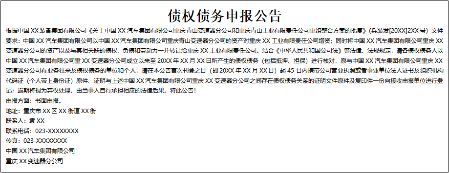 根據(jù)中國XX裝備集團有限公司《關(guān)于中國XX汽車集團有限公司重慶青山變速器分公司和重慶青山工業(yè)有限責任公司重組整合方案的批復(fù)》(兵裝發(fā)[20XX]2XX號)文件要求:中國XX汽車集團有限公司以中國XX汽車集團有限公司重慶青山變速器分公司的資產(chǎn)對重慶XX工業(yè)有限責任公司增資;同時將中國XX汽車集團有限公司重慶XX變速器分公司的資產(chǎn)以及與其相關(guān)聯(lián)的債權(quán)、負債和勞動力一并轉(zhuǎn)讓給重慶XX工業(yè)有限責任公司。結(jié)合《中華人民共和國公司法》等法律、法規(guī)規(guī)定,請各債權(quán)債務(wù)人以中國XX汽車集團有限公司重XX變速器分公司成立以來至20XX年XX月XX日所產(chǎn)生的債權(quán)債務(wù)(包括抵押、擔保)進行核對,原與中國XX汽車集團有限公司重慶XX變速器分公司有業(yè)務(wù)往來及債權(quán)債務(wù)的單位和個人,請在本公告首次刊登之日(即20XX年XX月XX日)起45日內(nèi)攜帶公司營業(yè)執(zhí)照或者事業(yè)單位法人證書及組織機構(gòu)代碼證(個人帶上身份證)原件、證明與上述中國XX汽車集團有限公司重慶XX變速器分公司之間存在債權(quán)債務(wù)關(guān)系的證明文件原件及復(fù)印件一份向接收申報單位進行登記;逾期將視為棄權(quán)處理,由當事人自行承擔相應(yīng)的法律后果。特此公告!