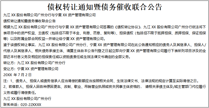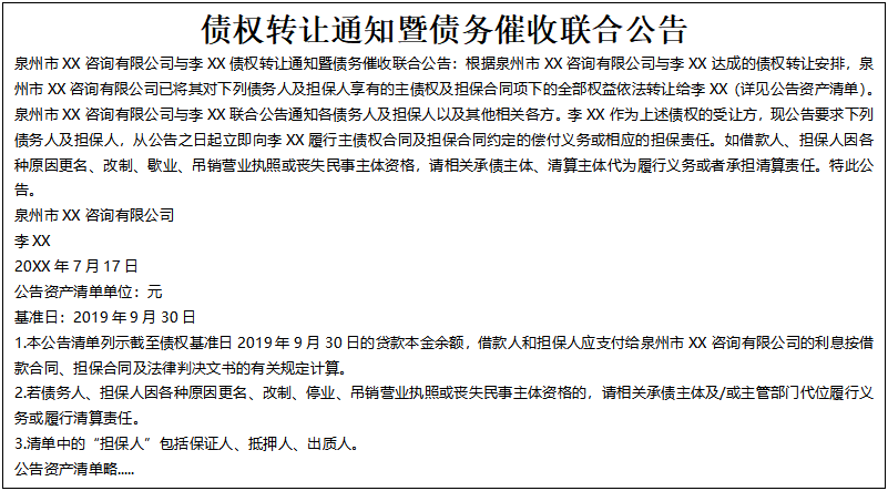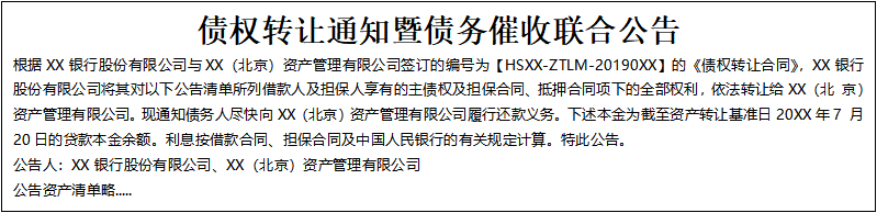 根據(jù)XX銀行股份有限公司與XX(北京)資產(chǎn)管理有限公司簽訂的編號(hào)為【HSXX-ZTLM-20190XX】的《債權(quán)轉(zhuǎn)讓合同》,XX銀行股份有限公司將其對(duì)以下公告清單所列借款人及擔(dān)保人享有的主債權(quán)及擔(dān)保合同、抵押合同項(xiàng)下的全部權(quán)利,依法轉(zhuǎn)讓給XX(北 京)資產(chǎn)管理有限公司,F(xiàn)通知債務(wù)人盡快向XX(北京)資產(chǎn)管理有限公司履行還款義務(wù)。下述本金為截至資產(chǎn)轉(zhuǎn)讓基準(zhǔn)日20XX年7 月20日的貸款本金余額。利息按借款合同、擔(dān)保合同及中國(guó)人民銀行的有關(guān)規(guī)定計(jì)算。特此公告。