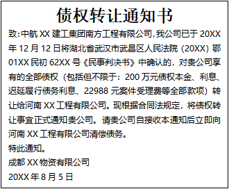 致:中航XX建工集團(tuán)南方工程有限公司,我公司已于20XX年12月12日將湖北省武漢市武昌區(qū)人民法院(20XX)鄂01XX民初62XX號(hào)《民事判決書(shū)》中確認(rèn)的,對(duì)貴公司享有的全部債權(quán)(包括但不限于:200萬(wàn)元債權(quán)本金、利息、遲延履行債務(wù)利息、22988元案件受理費(fèi)等全部款項(xiàng))轉(zhuǎn)讓給河南XX工程有限公司,F(xiàn)根據(jù)合同法規(guī)定,將債權(quán)轉(zhuǎn)讓事宜正式通知貴公司。請(qǐng)貴公司自接收本通知后立即向河南XX工程有限公司清償債務(wù)。