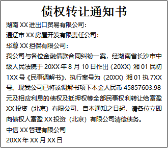我公司與各位金融借款合同糾紛一案,經(jīng)湖南省長(zhǎng)沙市中級(jí)人民法院于20XX年8月10日作出(20XX)湘01民初1XX號(hào)《民事調(diào)解書(shū)》,執(zhí)行案號(hào)為(20XX)湘01執(zhí)7XX號(hào),F(xiàn)我公司已將該調(diào)解書(shū)項(xiàng)下本金人民幣45857603.98元及相應(yīng)利息的債權(quán)及抵押權(quán)等全部民事權(quán)利轉(zhuǎn)讓給富盈XX投資(北京)有限公司,自本通知之日起,請(qǐng)各位立即向債權(quán)人富盈XX投資(北京)有限公司清償債務(wù)。