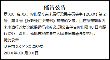 羅XX、金XX:你們至今尚未履行梁民宗罰決字【20XX】第2號(hào)、第3號(hào)《行政處罰決定書》確定的義務(wù),且在法定期限內(nèi)未申請(qǐng)行政復(fù)議或提起行政訴訟,F(xiàn)公告催告你們限10日內(nèi)履行義務(wù),否則,我機(jī)關(guān)將依法向人民法院申請(qǐng)強(qiáng)制執(zhí)行。