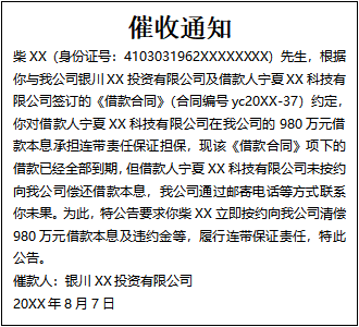 柴XX(身份證號:4103031962XXXXXXXX)先生,根據(jù)你與我公司銀川XX投資有限公司及借款人寧夏XX科技有限公司簽訂的《借款合同》(合同編號yc20XX-37)約定,你對借款人寧夏XX科技有限公司在我公司的980萬元借款本息承擔連帶責任保證擔保,現(xiàn)該《借款合同》項下的借款已經(jīng)全部到期,但借款人寧夏XX科技有限公司未按約向我公司償還借款本息,我公司通過郵寄電話等方式聯(lián)系你未果。為此,特公告要求你柴XX立即按約向我公司清償980萬元借款本息及違約金等,履行連帶保證責任,特此公告。
