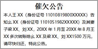 本人王XX(身份證號11010819800XXXXX)告知幺XX(身份證號1101051982XXXXX)及其妻子梁XX、劉XX,20XX年1月至20XX年8月王XX多次轉(zhuǎn)賬給幺XX及梁XX、劉XX1500萬元,請盡快歸還,特此公告。