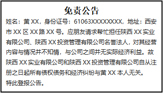 姓名:黃XX,身份證號(hào):61063XXXXXXXX,地址:西安市XX區(qū)XX路XX號(hào)。應(yīng)朋友請(qǐng)求幫忙擔(dān)任陜西XX實(shí)業(yè)有限公司、陜西XX投資管理有限公司名譽(yù)法人,對(duì)其經(jīng)營(yíng)內(nèi)容與情況并不知情,與公司之間并無(wú)實(shí)際經(jīng)濟(jì)利益。故陜西XX實(shí)業(yè)有限公司和陜西XX投資管理有限公司自從注冊(cè)之日起所有債權(quán)債務(wù)和經(jīng)濟(jì)糾紛與黃XX本人無(wú)關(guān)。