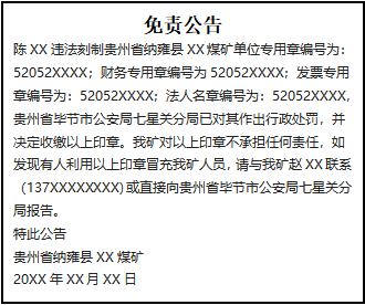 陳XX違法刻制貴州省納雍縣XX煤礦單位專用章編號(hào)為:52052XXXX;財(cái)務(wù)專用章編號(hào)為52052XXXX;發(fā)票專用章編號(hào)為:52052XXXX;法人名章編號(hào)為:52052XXXX,貴州省畢節(jié)市公安局七星關(guān)分局已對(duì)其作出行政處罰,并決定收繳以上印章。我礦對(duì)以上印章不承擔(dān)任何責(zé)任,如發(fā)現(xiàn)有人利用以上印章冒充我礦人員,請(qǐng)與我礦趙XX聯(lián)系(137XXXXXXXX)或直接向貴州省畢節(jié)市公安局七星關(guān)分局報(bào)告。