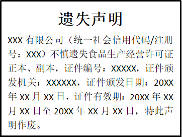 XXX有限公司(統(tǒng)一社會信用代碼/注冊號:XXX)不慎遺失食品生產(chǎn)經(jīng)營許可證正本、副本,證件編號:XXXXX,證件頒發(fā)機關(guān):XXXXXX,證件頒發(fā)日期:20XX年XX月XX日,證件有效期:20XX年XX月XX日至20XX年XX月XX日,特此聲明作廢。