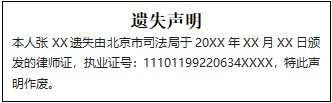本人張XX遺失由北京市司法局于20XX年XX月XX日頒發(fā)的律師證,執(zhí)業(yè)證號(hào):11101199220634XXXX,特此聲明作廢。