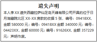 本人李XX遺失西藏拉薩仙足島天峰有限公司開具的位于日月湖藏院北區(qū)XX-XX房款的收據(jù)5張,編號:09418XX,金額580000元;編號:09418XX金額340000元;編號:04423XX,金額60000元;編號:91626XX,金額357229元;聲明作廢。
