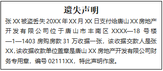 張XX被盜丟失20XX年XX月XX日支付給唐山XX房地產(chǎn)開發(fā)有限公司位于唐山市豐南區(qū)XXXX—18號(hào)樓—1—1403房購(gòu)房款31萬收據(jù)一張,該收據(jù)交款人是張XX,該收據(jù)收款單位蓋章是唐山XX房地產(chǎn)開發(fā)有限公司財(cái)務(wù)專用章,編號(hào)02111XX,特此聲明作廢。