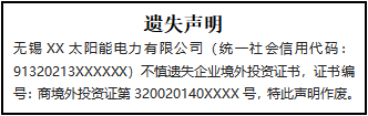 無(wú)錫XX太陽(yáng)能電力有限公司(統(tǒng)一社會(huì)信用代碼:91320213XXXXXX)不慎遺失企業(yè)境外投資證書(shū),證書(shū)編號(hào):商境外投資證第320020140XXXX號(hào),特此聲明作廢。