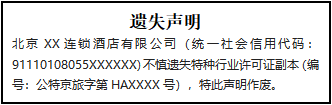 北京XX連鎖酒店有限公司(統(tǒng)一社會信用代碼:91110108055XXXXXX)不慎遺失特種行業(yè)許可證副本(編號:公特京旅字第HAXXXX號),特此聲明作廢。