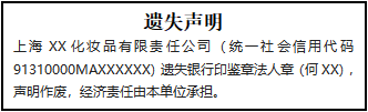 上海XX化妝品有限責(zé)任公司(統(tǒng)一社會信用代碼91310000MAXXXXXX)遺失銀行印鑒章法人章(何XX),聲明作廢,經(jīng)濟責(zé)任由本單位承擔(dān)。