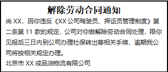 尚XX,因你違反《XX公司駕駛員、押運(yùn)員管理制度》第二條第11款的規(guī)定,公司對(duì)你做解除勞動(dòng)合同處理,限你見報(bào)后三日內(nèi)到公司辦理社保轉(zhuǎn)出等相關(guān)手續(xù),逾期我公司將按相關(guān)規(guī)定辦理。