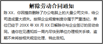 陳XX,你因擅自刪除了辦公電腦上的大量公司文件,給公司造成重大損失。按照企業(yè)規(guī)章制度你屬于嚴(yán)重違紀(jì),單位已經(jīng)于20XX年XX月XX日解除你與企業(yè)簽訂的勞動(dòng)合同。請(qǐng)你在見通知后一周內(nèi)盡快到單位辦理相關(guān)手續(xù),逾期不來將按相關(guān)規(guī)定處理,特此告知。