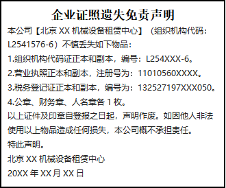 本公司【北京XX機(jī)械設(shè)備租賃中心】(組織機(jī)構(gòu)代碼:L2541576-6)不慎丟失如下物品: