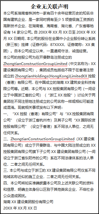 二、ZhongtianConstructionGroupLimited(XX建設(shè)集團(tuán)有限公司)成立于開(kāi)曼群島,與中國(guó)大陸注冊(cè)成立的XX控股集團(tuán)有限公司旗下子公司XX建設(shè)集團(tuán)有限公司(一間設(shè)立于浙江省東陽(yáng)市的公司)系在不同法律體系的法人單位,二者之間無(wú)任何關(guān)系。