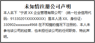 本人名下“寧波XX企業(yè)管理有限公司”(統(tǒng)一社會(huì)信用代碼:91330201XXXXXXXX)是本人湯XX,身份證:330902xxxxxxxx4968在不知情的情況下注冊(cè)的,本人未參與該公司的經(jīng)營(yíng),也未擔(dān)任該公司的任何職務(wù),特此聲明。