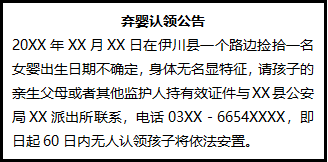 20XX年XX月XX日在伊川縣一個(gè)路邊撿拾一名女嬰出生日期不確定,身體無名顯特征,請孩子的親生父母或者其他監(jiān)護(hù)人持有效證件與XX縣公安局XX派出所聯(lián)系,電話03XX-6654XXXX,即日起60日內(nèi)無人認(rèn)領(lǐng)孩子將依法安置。