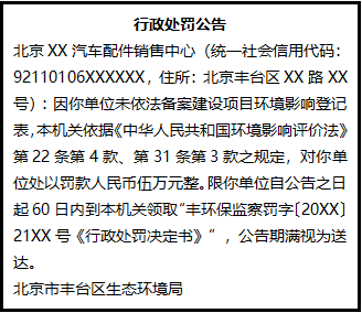 北京XX汽車配件銷售中心(統(tǒng)一社會(huì)信用代碼:92110106XXXXXX,住所:北京豐臺(tái)區(qū)XX路XX號(hào)):因你單位未依法備案建設(shè)項(xiàng)目環(huán)境影響登記表,本機(jī)關(guān)依據(jù)《中華人民共和國(guó)環(huán)境影響評(píng)價(jià)法》第22條第4款、第31條第3款之規(guī)定,對(duì)你單位處以罰款人民幣伍萬(wàn)元整。限你單位自公告之日起60日內(nèi)到本機(jī)關(guān)領(lǐng)取“豐環(huán)保監(jiān)察罰字〔20XX〕21XX號(hào)《行政處罰決定書》”,公告期滿視為送達(dá)。