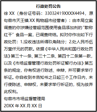 徐XX(身份證號(hào)碼:33032419XXXX4494,原句容市天王鎮(zhèn)XX購(gòu)物超市經(jīng)營(yíng)者):由本局立案調(diào)查的你涉嫌經(jīng)營(yíng)超范圍使用食品添加劑的“散稱紅干”食品一案,已調(diào)查終結(jié)。擬對(duì)你作出如下行政處罰:1.沒(méi)收違法所得玖角陸分;2.處人民幣伍萬(wàn)壹仟元的罰款。依據(jù)《中華人民共和國(guó)行政處罰法》第三十一條、第三十二條、第四十二條第一款,以及《市場(chǎng)監(jiān)督管理行政處罰聽(tīng)證暫行辦法》第五條的規(guī)定,你有權(quán)進(jìn)行陳述、申辯,并可要求舉行聽(tīng)證。你自收到本告知書之日起三個(gè)工作日內(nèi),未行使陳述、申辯權(quán),未要求舉行聽(tīng)證的,視為放棄此權(quán)利。