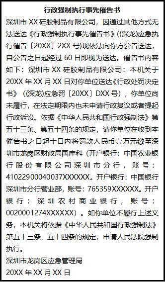 深圳市XX硅膠制品有限公司,因通過其他方式無法送達(dá)《行政強(qiáng)制執(zhí)行事先催告書》((深龍)應(yīng)急執(zhí)行催告〔20XX〕2XX號(hào))現(xiàn)依法向你方公告送達(dá),自公告之日起經(jīng)過60日即視為送達(dá)。催告書內(nèi)容如下:深圳市XX硅膠制品有限公司:本機(jī)關(guān)于20XX年XX月XX日對(duì)你單位送達(dá)《行政處罰決定書》((深龍)應(yīng)急罰〔20XX〕DXX號(hào)),你單位尚未履行,在法定期限內(nèi)也未申請(qǐng)行政復(fù)議或者提起行政訴訟。依據(jù)《中華人民共和國行政強(qiáng)制法》第五十三條、第五十四條的規(guī)定,請(qǐng)你單位在收到本催告書之日起十日內(nèi)將罰款人民幣壹萬元繳至深圳市龍崗區(qū)財(cái)政局國庫科(開戶銀行:中國農(nóng)業(yè)銀行股份有限公司深圳市分行,賬號(hào):41022900040037XXXXXX。開戶銀行:中國銀行深圳市分行營(yíng)業(yè)部,賬號(hào):765359XXXXXX。開戶銀行:深圳農(nóng)村商業(yè)銀行,賬號(hào):0020001274XXXXXX)。如你單位不履行上述義務(wù),本機(jī)關(guān)將依據(jù)《中華人民共和國行政強(qiáng)制法》第五十三條、五十四條的規(guī)定,申請(qǐng)人民法院強(qiáng)制執(zhí)行。