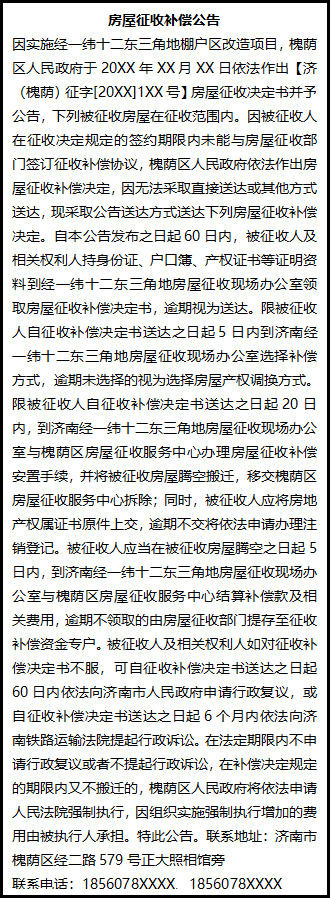 因實施經一緯十二東三角地棚戶區(qū)改造項目,槐蔭區(qū)人民政府于20XX年XX月XX日依法作出【濟(槐蔭)征字[20XX]1XX號】房屋征收決定書并予公告,下列被征收房屋在征收范圍內。因被征收人在征收決定規(guī)定的簽約期限內未能與房屋征收部門簽訂征收補償協(xié)議,槐蔭區(qū)人民政府依法作出房屋征收補償決定,因無法采取直接送達或其他方式送達,現(xiàn)采取公告送達方式送達下列房屋征收補償決定。自本公告發(fā)布之日起60日內,被征收人及相關權利人持身份證、戶口簿、產權證書等證明資料到經一緯十二東三角地房屋征收現(xiàn)場辦公室領取房屋征收補償決定書,逾期視為送達。限被征收人自征收補償決定書送達之日起5日內到濟南經一緯十二東三角地房屋征收現(xiàn)場辦公室選擇補償方式,逾期未選擇的視為選擇房屋產權調換方式。限被征收人自征收補償決定書送達之日起20日內,到濟南經一緯十二東三角地房屋征收現(xiàn)場辦公室與槐蔭區(qū)房屋征收服務中心辦理房屋征收補償安置手續(xù),并將被征收房屋騰空搬遷,移交槐蔭區(qū)房屋征收服務中心拆除;同時,被征收人應將房地產權屬證書原件上交,逾期不交將依法申請辦理注銷登記。被征收人應當在被征收房屋騰空之日起5日內,到濟南經一緯十二東三角地房屋征收現(xiàn)場辦公室與槐蔭區(qū)房屋征收服務中心結算補償款及相關費用,逾期不領取的由房屋征收部門提存至征收補償資金專戶。被征收人及相關權利人如對征收補償決定書不服,可自征收補償決定書送達之日起60日內依法向濟南市人民政府申請行政復議,或自征收補償決定書送達之日起6個月內依法向濟南鐵路運輸法院提起行政訴訟。在法定期限內不申請行政復議或者不提起行政訴訟,在補償決定規(guī)定的期限內又不搬遷的,槐蔭區(qū)人民政府將依法申請人民法院強制執(zhí)行,因組織實施強制執(zhí)行增加的費用由被執(zhí)行人承擔。特此公告。聯(lián)系地址:濟南市槐蔭區(qū)經二路579號正大照相館旁
