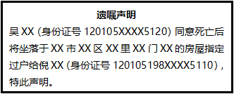 吳XX(身份證號120105XXXX5120)同意死亡后將坐落于XX市XX區(qū)XX里XX門XX的房屋指定過戶給倪XX(身份證號120105198XXXX5110),特此聲明。