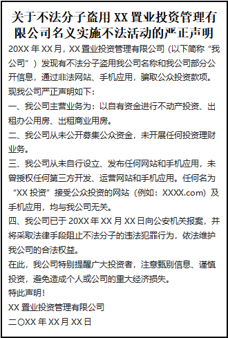 20XX年XX月,XX置業(yè)投資管理有限公司(以下簡稱“我公司”)發(fā)現(xiàn)有不法分子盜用我公司名稱和我公司部分公開信息,通過非法網(wǎng)站、手機應用,騙取公眾投資款項,F(xiàn)我公司嚴正聲明如下: