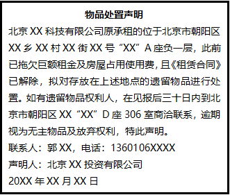 北京XX科技有限公司原承租的位于北京市朝陽區(qū)XX鄉(xiāng)XX村XX街XX號“XX”A座負(fù)一層,此前已拖欠巨額租金及房屋占用使用費(fèi),且《租賃合同》已解除,擬對存放在上述地點(diǎn)的遺留物品進(jìn)行處置。如有遺留物品權(quán)利人,在見報(bào)后三十日內(nèi)到北京市朝陽區(qū)XX“XX”D座306室商洽聯(lián)系,逾期視為無主物品及放棄權(quán)利,特此聲明。