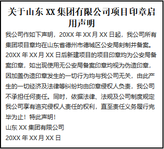 20XX年XX月XX日后新建項目的項目印章均為公安局備案印章,如出現(xiàn)使用無公安局備案印章均視為偽造印章,因加蓋偽造印章發(fā)生的一切行為均與我公司無關,由此產(chǎn)生的一切經(jīng)濟及法律等糾紛均由印章侵權(quán)人負責,我公司不承擔任何責任。同時,依據(jù)法律、法規(guī)及公司制度規(guī)定我公司享有追究侵權(quán)人責任的權(quán)利,直至責任義務履行完畢為止!特此聲明!