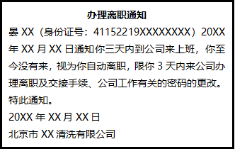 晏XX(身份證號(hào):41152219XXXXXXXX)20XX年XX月XX日通知你三天內(nèi)到公司來(lái)上班,你至今沒(méi)有來(lái),視為你自動(dòng)離職,限你3天內(nèi)來(lái)公司辦理離職及交接手續(xù)、公司工作有關(guān)的密碼的更改。